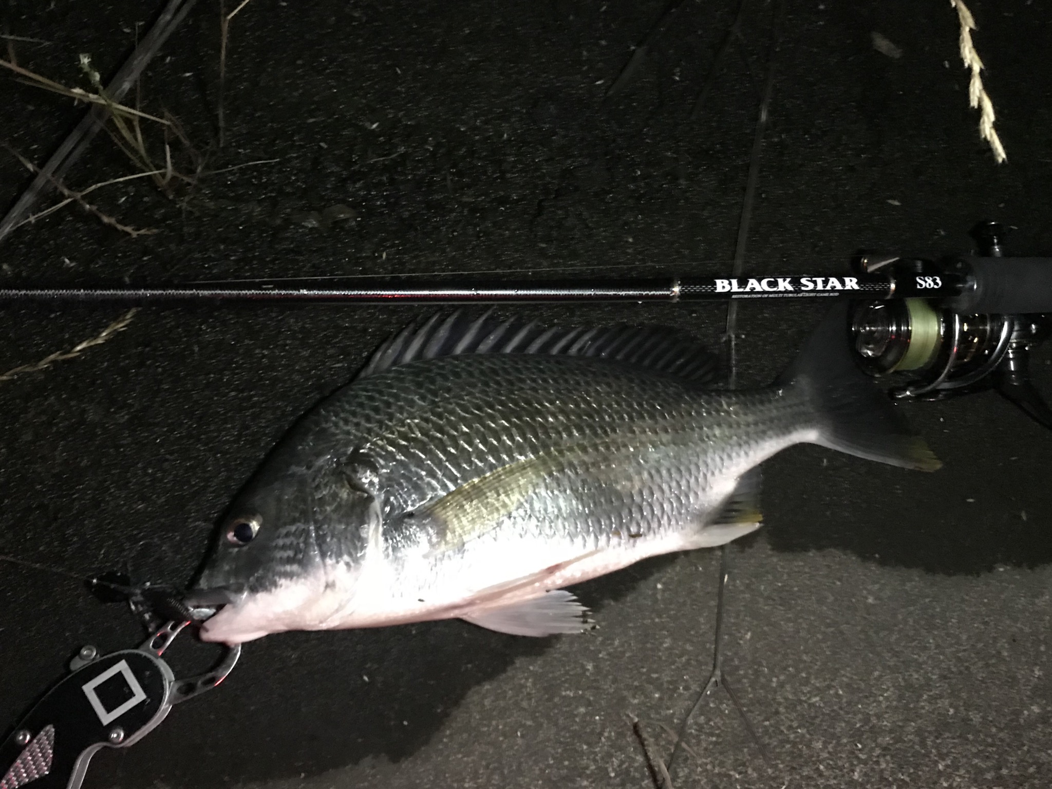 スピニングで、メインライン6ポンド、リーダー8ポンド。
