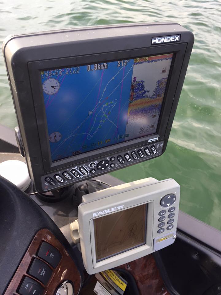 ボーターである八田さんの魚探(HE820)をコンソールに着け、ポイント等をマークしながら、釣りしながら、、、。