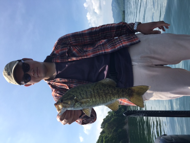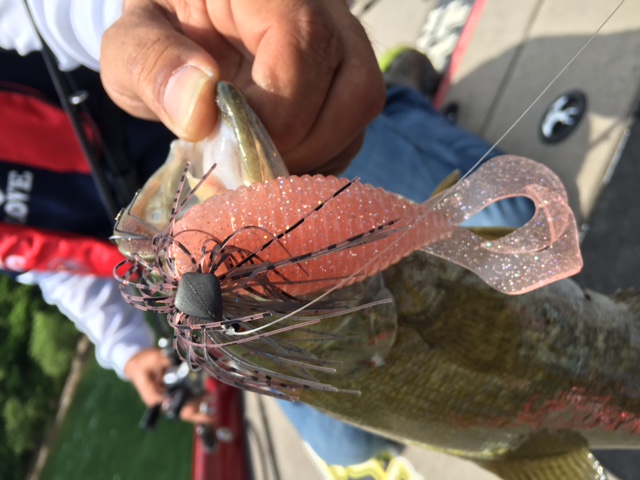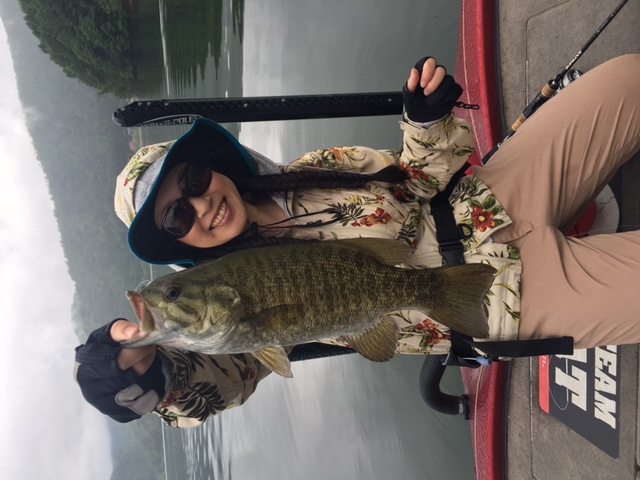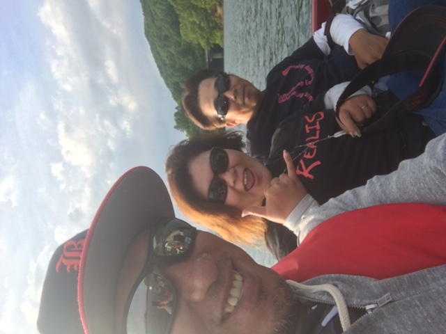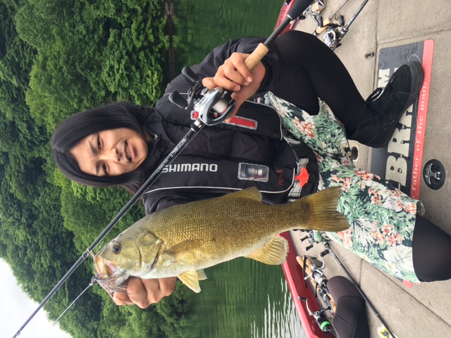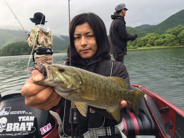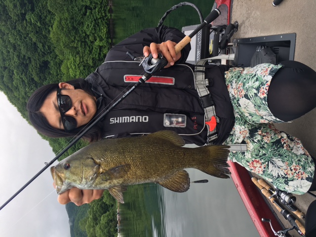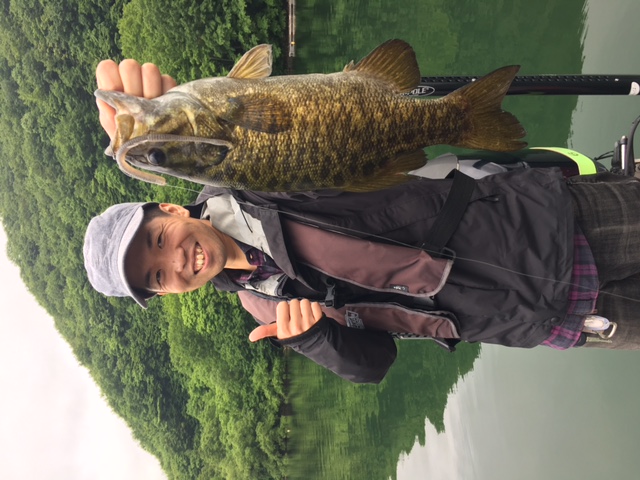 前半戦ノーフィッシュの先生の弟子?さんは初桧原湖で万が一デコったときのためにスモールマウスバスのぬいぐるみで記念撮影(笑)