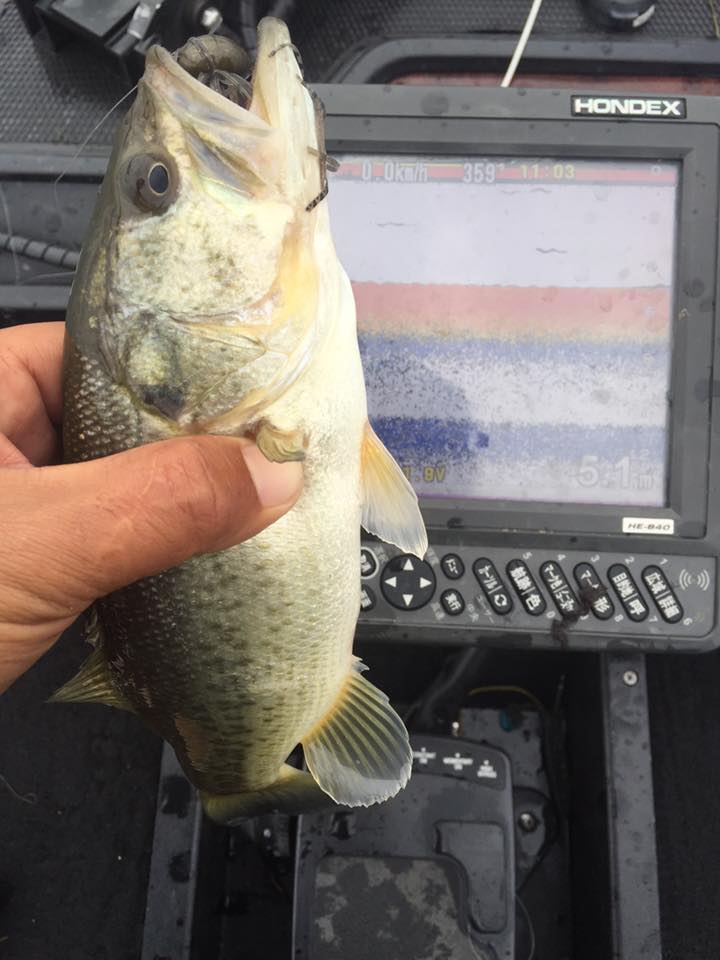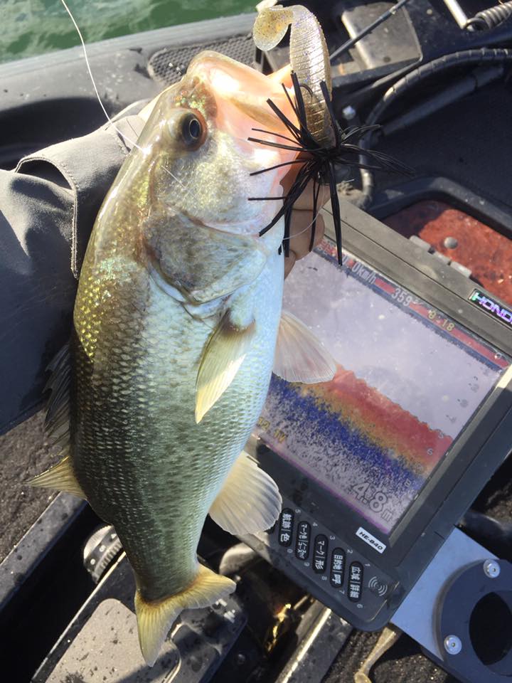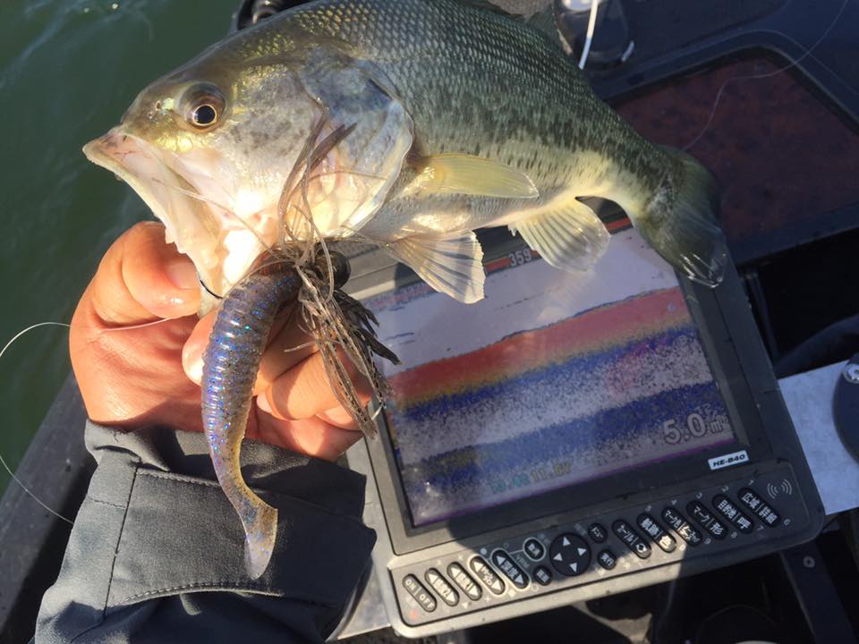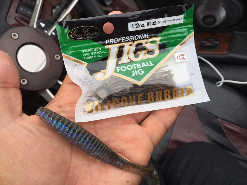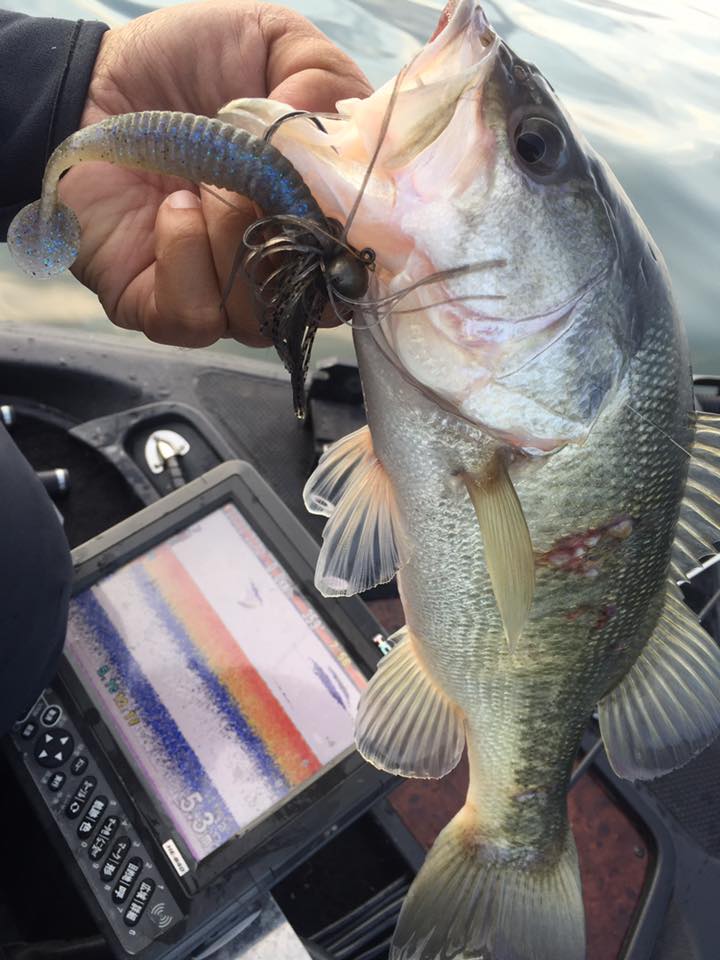 この日は強風が吹く予報だったので、いつもは朝クランクからスタートするのですが、朝の風がないうちにフットボールジグでボトム展開から。