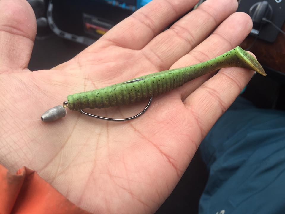 ボートはほぼどてらで流しながら、ヘビダンを風下にど遠投。ずる引き&ステイを、10秒-7秒-7秒のリズムで引っ張ってくるだけ。