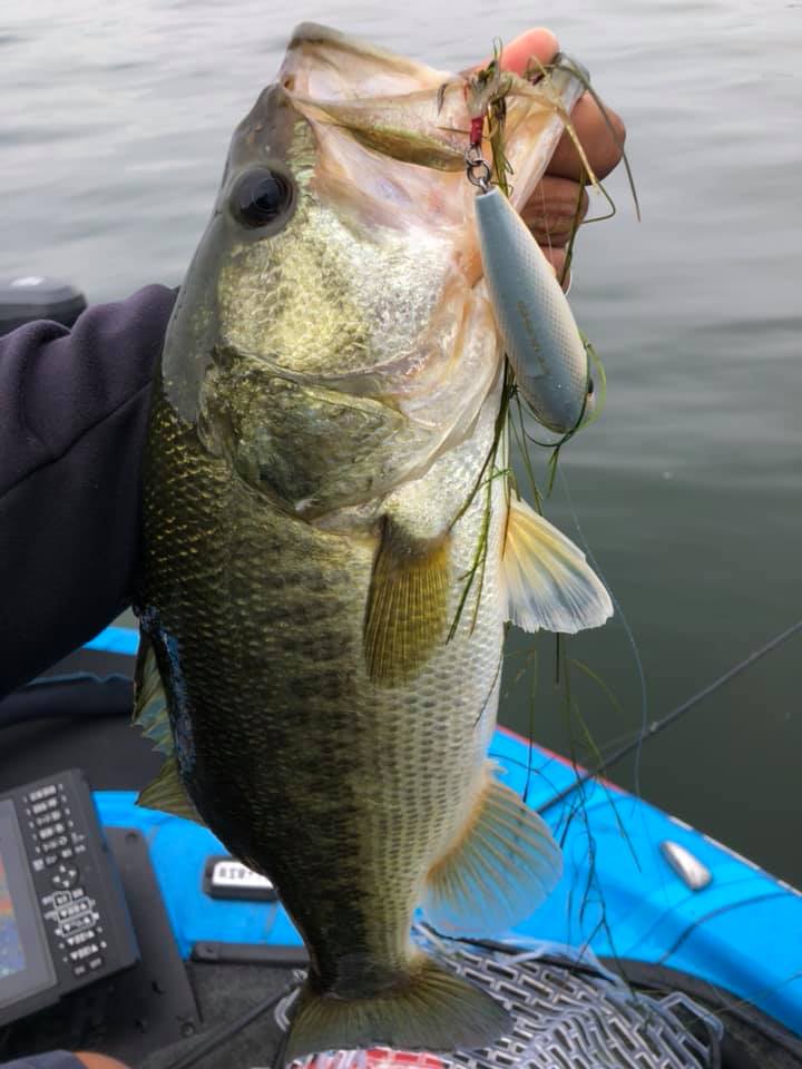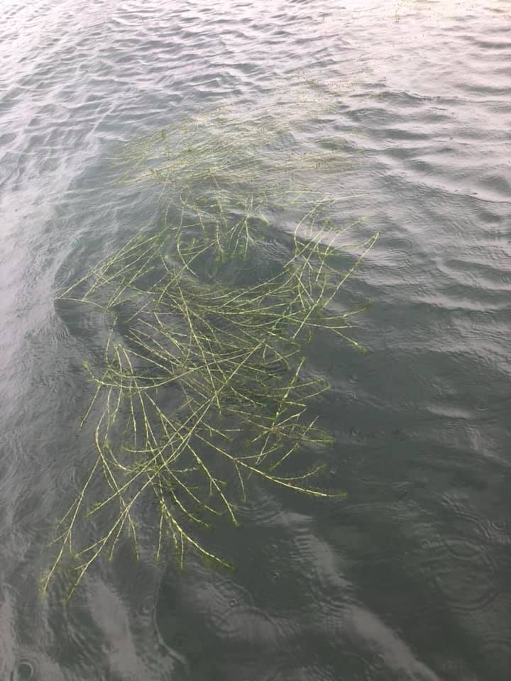バスがカナダモの中を走り、フッキングからやり取りの際にラインで周辺のカナダモが切れて浮いてきます。